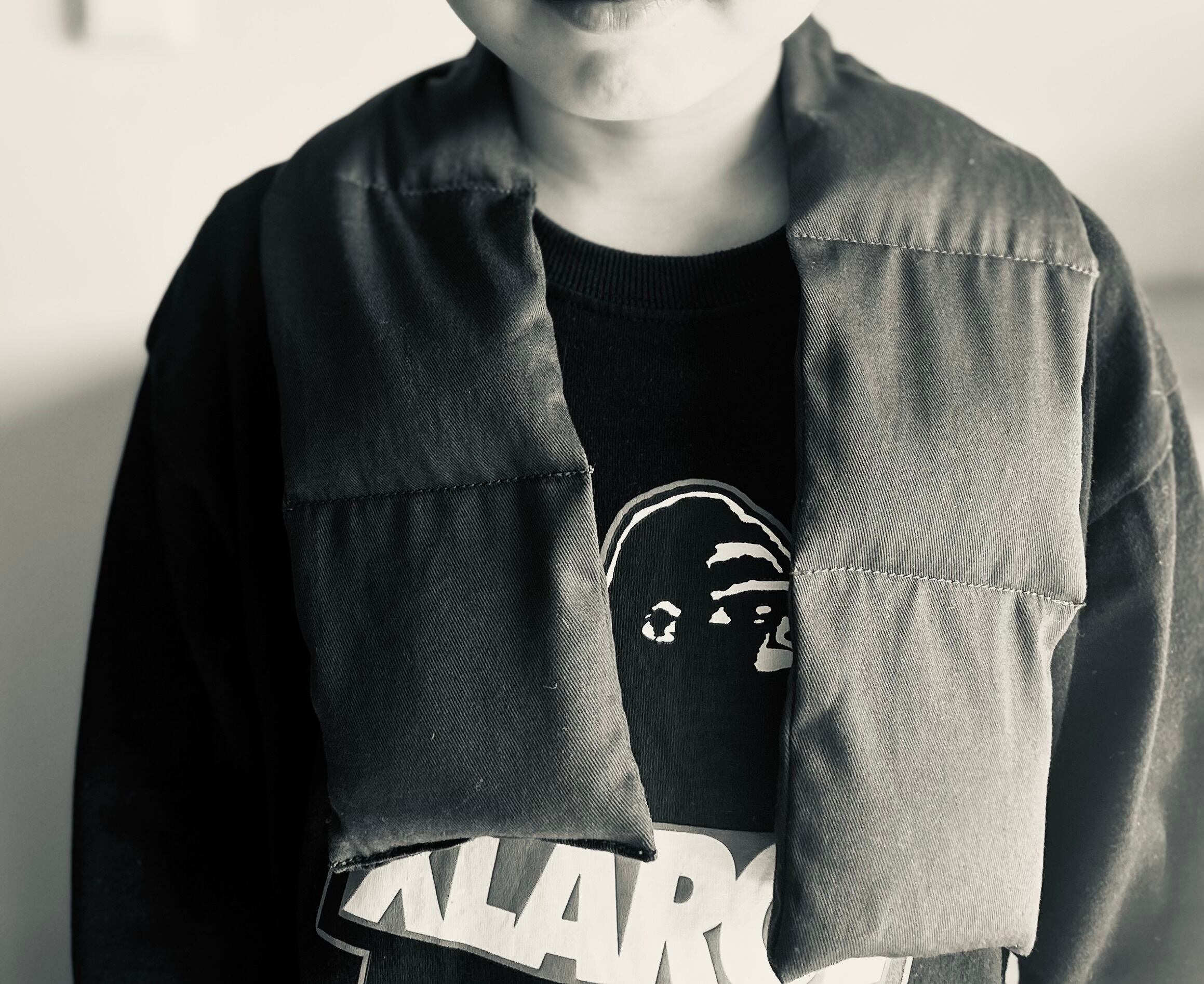 中にはたっぷりの玄米。重すぎず軽すぎない絶妙な重みが、肩やお腹に「ぴたっ」とフィット。